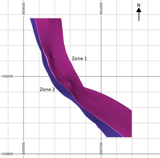 An Inferred Mineral Resource was estimated based on two geologically distinct structures, named Zone 1 and Zone 2. Zone 1 is the stratigraphically upper zone of mineralization and Zone 2 is the stratigraphically lower zone. The wireframes were built along strike beyond the influence of the data to assist with target generation, and the Resource was constrained by a hard boundary, informed by the search distance, post-estimation.