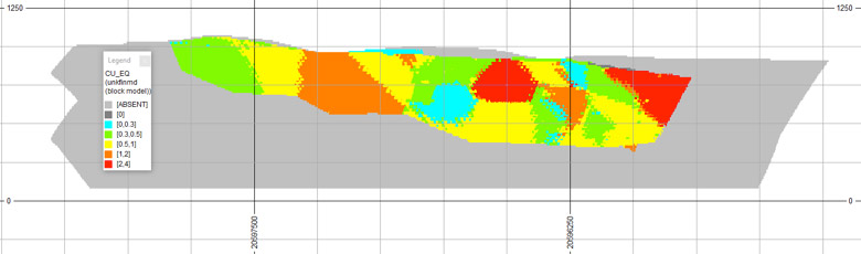 Figure 3: Isometric View of Cu Eqv. Grade distribution (looking sw)